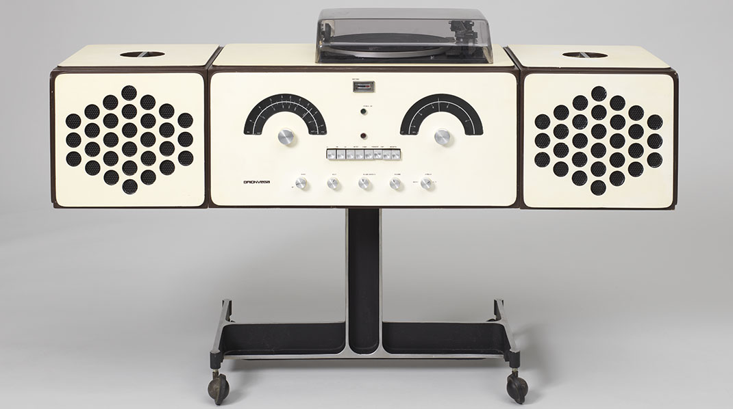 ITitle Image: RR-126 Radio-Phonograph, 1965; Designed by Achille Castiglioni (Italian, 1918-2002) and Pier Giacomo Castiglioni, (Italian, 1913-1968); Manufactured by Brionvega, S.p.A (Milan, Italy); Plywood, plastic, aluminum, polycarbonate, electronic components; H x W x D (speakers on sides): 46.5 × 121 × 36.5 cm (18 5/16 × 47 5/8 × 14 3/8 in.); H x W x D (speakers on top): 92.5 × 61.5 × 36.5 cm (36 7/16 × 24 3/16 × 14 3/8 in.); Cooper Hewitt, Smithsonian Design Museum; Gift of George R. Kravis II, 2018-22-96-a/c; Photo: Matt Flynn.